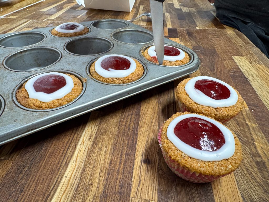 rengas tortun päälle ja renkaan keskelle pieni lusikallinen hilloa.