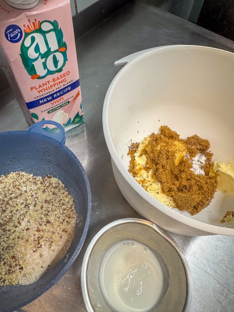 - Lisää kaurakerma tai muu vegekerma rasva-sokeriseokseen